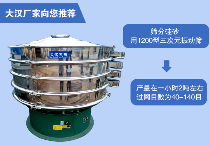 近期有客戶(hù)詢(xún)問(wèn)我們銷(xiāo)售客服問(wèn)篩分烘干后的硅砂產(chǎn)量在一小時(shí)2噸左右,過(guò)網(wǎng)目數(shù)為40-70目、70-140目適合用什么型號(hào)的振動(dòng)篩,小編根據(jù)客戶(hù)所篩分的物料與過(guò)網(wǎng)數(shù)目和產(chǎn)量推薦使用1200型三次元振動(dòng)篩
