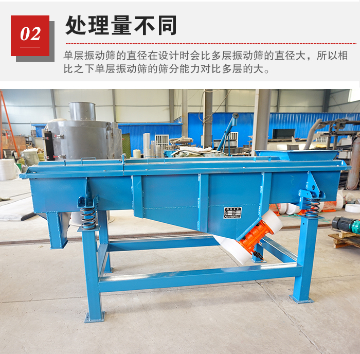 物料篩分產(chǎn)量是由篩網(wǎng)的直徑,也就是物料與篩網(wǎng)的接觸面積有直接關(guān)系的。而單層振動(dòng)篩的直徑在設(shè)計(jì)時(shí)會(huì)比多層振動(dòng)篩的直徑大,所以相比之下單層振動(dòng)篩的篩分能力對(duì)比多層的大。