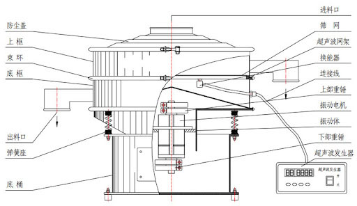 流通式超聲波篩由防塵蓋、進料斗、超聲波振動系統(tǒng)、篩網(wǎng)、出料口、減震底座、電機等組成。超聲波換能器均勻分布于篩網(wǎng)兩側(cè),通過高頻振動快速破除物料粘連,搭配耐磨不銹鋼篩網(wǎng),實現(xiàn)精細分級。中間層設(shè)導(dǎo)流板引導(dǎo)物料流通,底部減震底座采用橡膠減震墊,減少運行噪音與設(shè)備損耗。