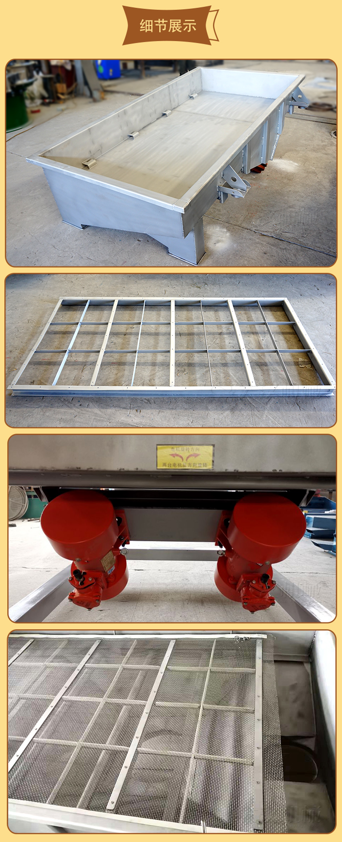 5、電機臺座:安裝振動電機,使用前連接螺釘必須擰緊,特別是新篩機試用前三天、必須反復緊固,以免松動造成事故。